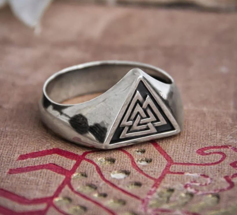 Triangle Valknut Ring made from 316L stainless steel. The perfect present for your friend or family member! This ring includes a black velvet gift/storage drawstring bag.