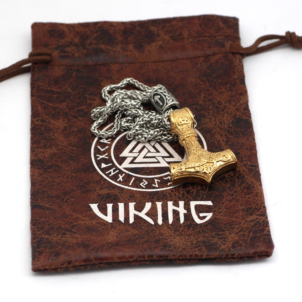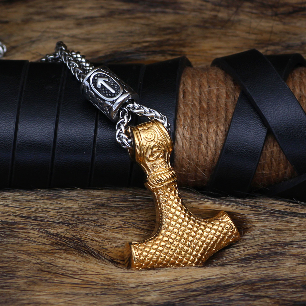 Viking Men’s Stainless Steel Pendant Celtic Wolf Gold Thor’s Hammer