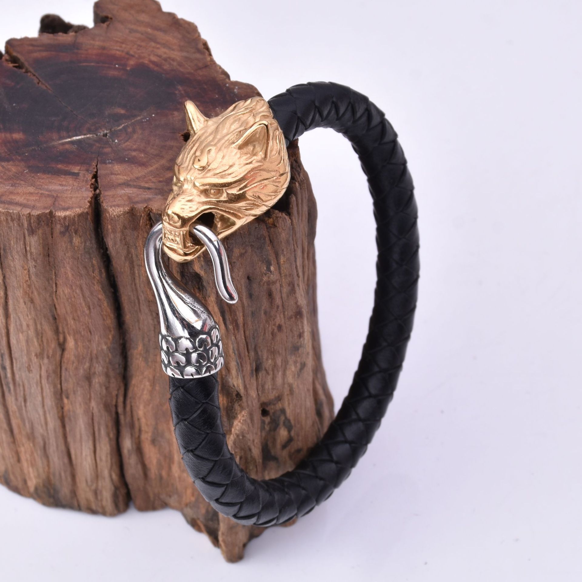 Viking Men’s Stainless Steel Wolf Head Leather Bracelet