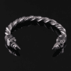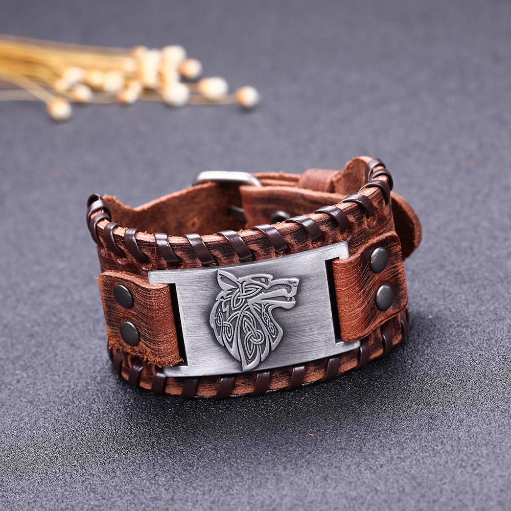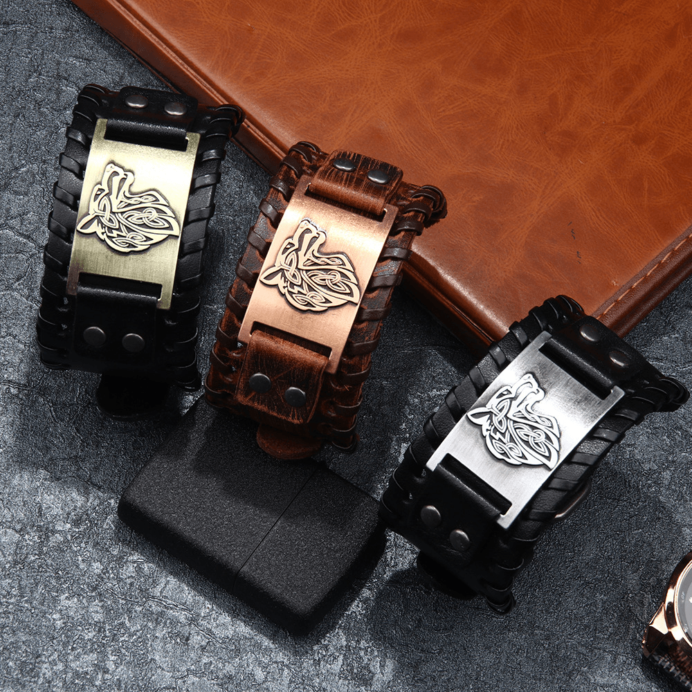 This AWESOME hand-crafted leather and metal piece is a classic viking cuff bracelet depicting Viking Wolves Head. Available in either Bronze, Silver or Gold!
