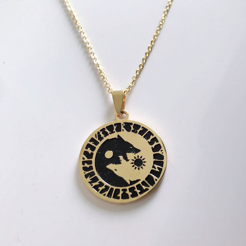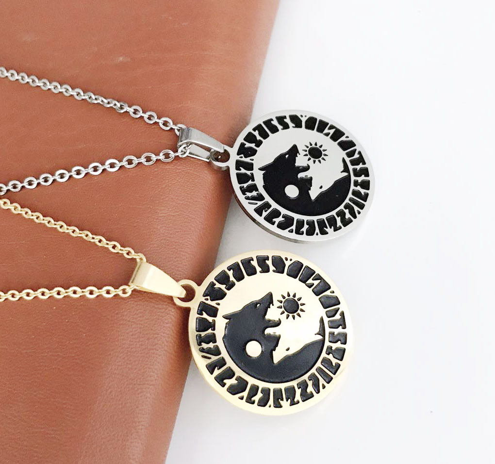 Baby name; wolf head sun and moon necklace Titanium steel viking logo pendant